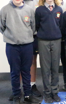 The school uniform consists of a navy jumper, grey trousers, grey shirt and tie. This can be purchased in Cash’s on Rossa Street.